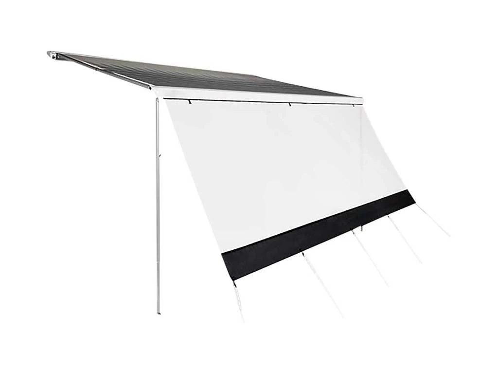 Een handige zonwerende voorwand. Biedt bescherming tegen de zon, zonder het zicht te blokkeren. De voorwand is gemakkelijk en snel te installeren door in de voorlijst de schuiven. Er is zowel een dunne- als dikke pees, zodat de voorwand in alle luifels en caravan rails past. Ook kan de voorwand vrijstaand worden opgezet. Compact op te rollen en vast te maken met een gesp. Wordt geleverd inclusief draagtas, haringen en scheerlijnen!