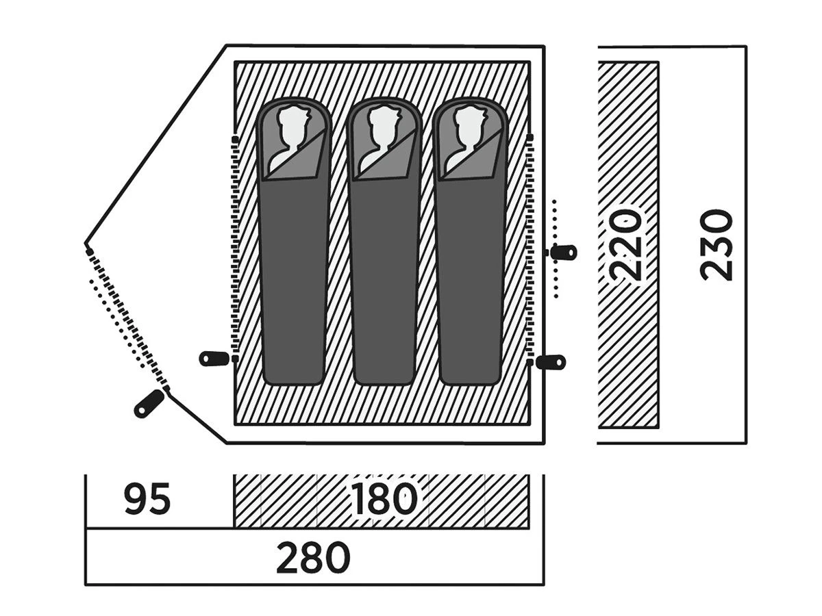 – Grondzeil binnentent: 75 D polyester Taffeta 185T PU coated, 5000 mm, PFC free water repellency
