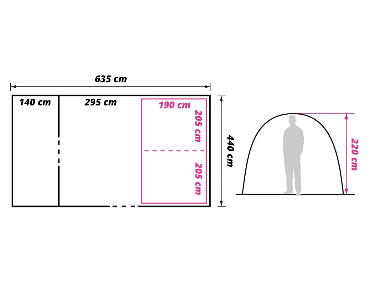 De tent is rondom voorzien van een vast kuipgrondzeil. Dit betekent dat het grondzeil onder de gehele tent vast aan het tentdoek gestikt zit. Zo kan er tijdens regenval geen regenwater naar binnen lopen en blijven je voeten en spullen droog. Een ander bijkomend voordeel van een vaste kuip is dat insecten en ongedierte buiten de tent blijven. Het grondzeil is aan de voorzijde bij de ingang